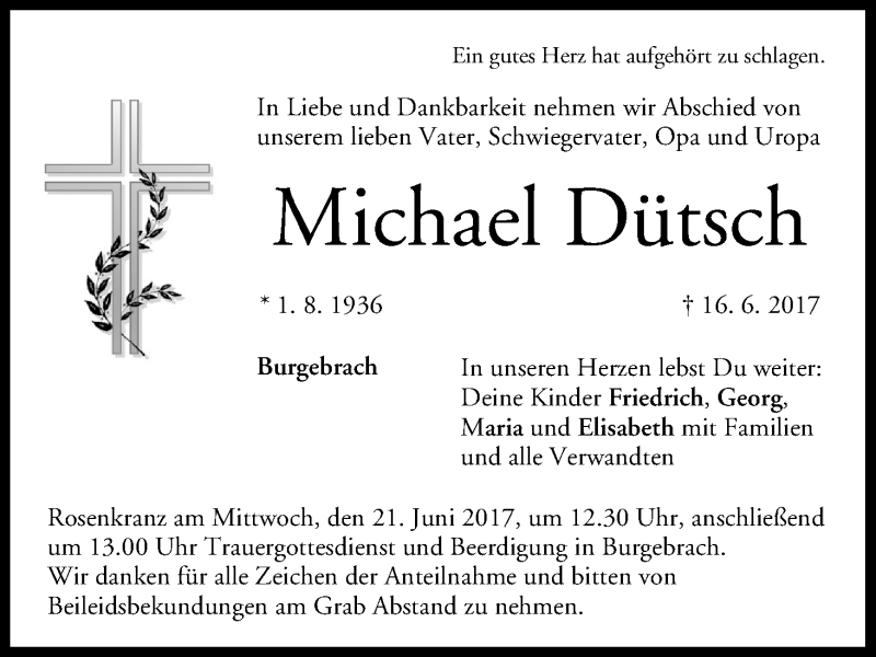 Hier finden Sie alle Traueranzeigen aus der Zeitung, die bisher für Michael Dütsch erschienen sind. Weitere Traueranzeigen, die in der Zeitung erscheinen, werden hier ebenfalls aufgelistet