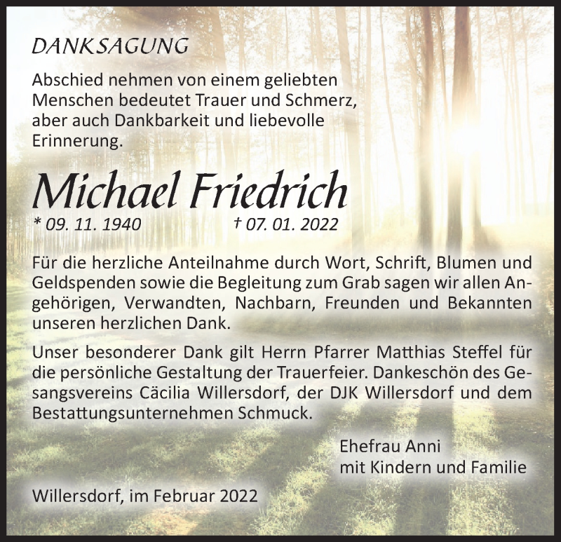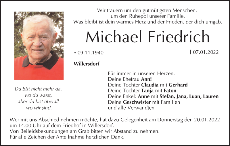 Hier finden Sie alle Traueranzeigen aus der Zeitung, die bisher für Michael Friedrich erschienen sind. Weitere Traueranzeigen, die in der Zeitung erscheinen, werden hier ebenfalls aufgelistet