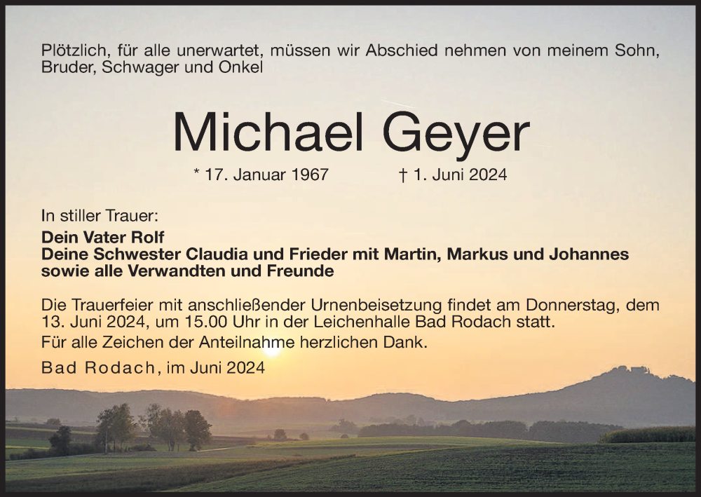 Hier finden Sie alle Traueranzeigen aus der Zeitung, die bisher für Michael Geyer erschienen sind. Weitere Traueranzeigen, die in der Zeitung erscheinen, werden hier ebenfalls aufgelistet