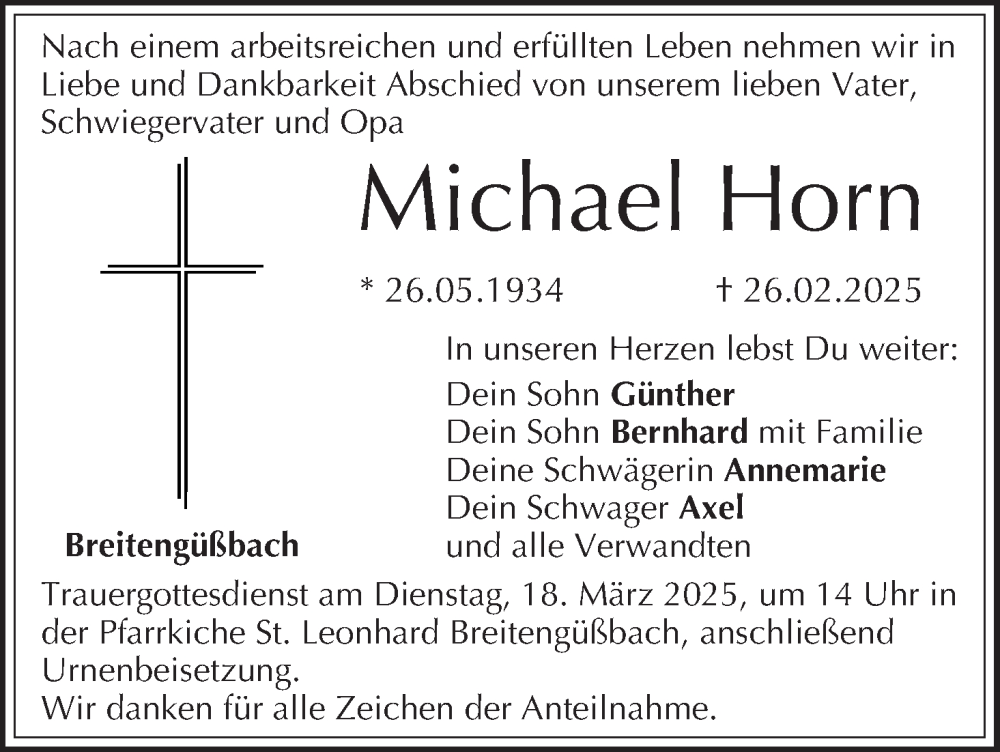 Hier finden Sie alle Traueranzeigen aus der Zeitung, die bisher für Michael Horn erschienen sind. Weitere Traueranzeigen, die in der Zeitung erscheinen, werden hier ebenfalls aufgelistet
