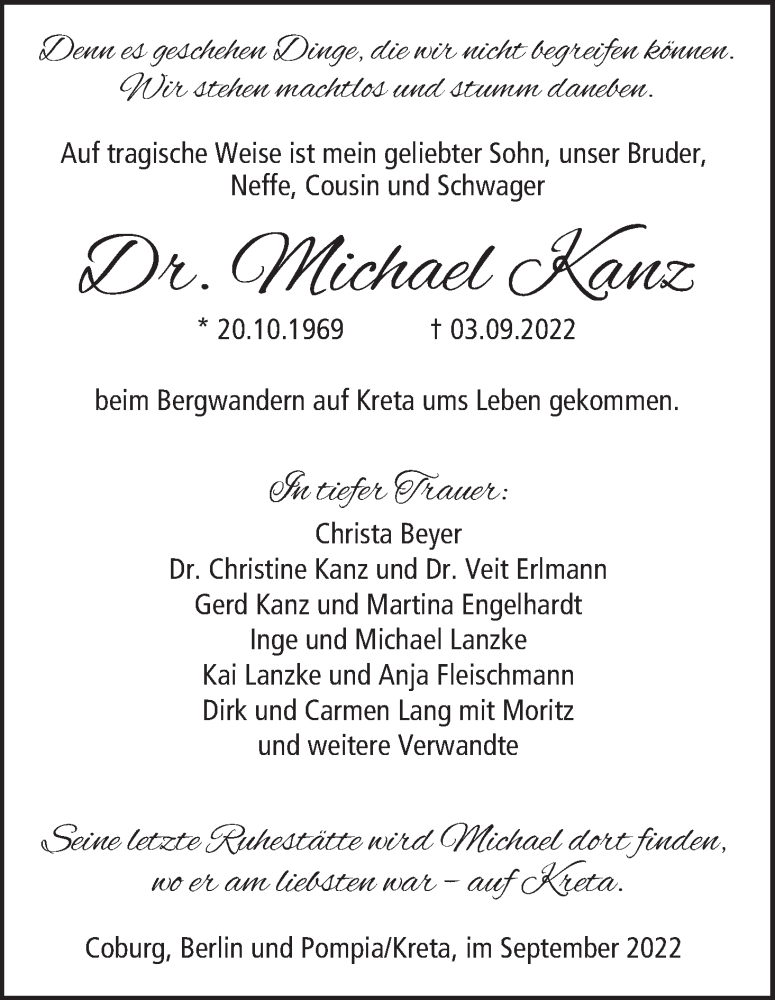 Hier finden Sie alle Traueranzeigen aus der Zeitung, die bisher für Michael Kanz erschienen sind. Weitere Traueranzeigen, die in der Zeitung erscheinen, werden hier ebenfalls aufgelistet