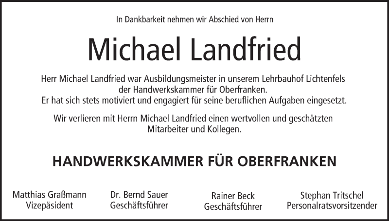Hier finden Sie alle Traueranzeigen aus der Zeitung, die bisher für Michael Landfried erschienen sind. Weitere Traueranzeigen, die in der Zeitung erscheinen, werden hier ebenfalls aufgelistet