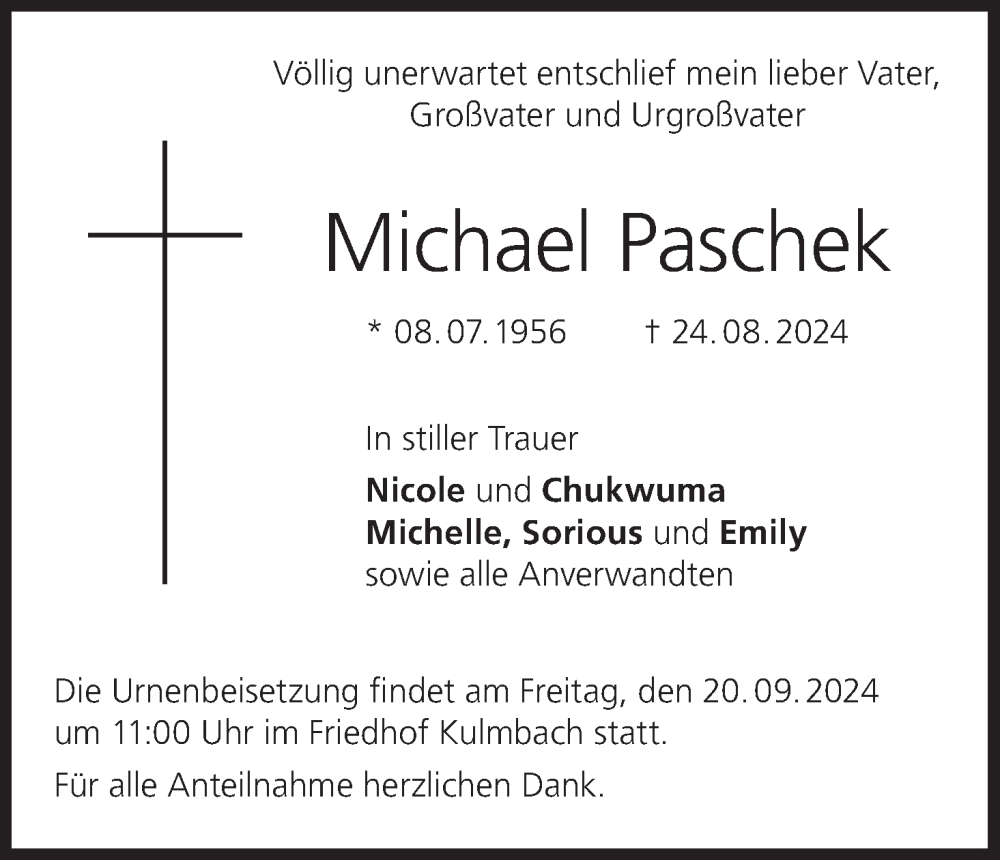 Hier finden Sie alle Traueranzeigen aus der Zeitung, die bisher für Michael Paschek erschienen sind. Weitere Traueranzeigen, die in der Zeitung erscheinen, werden hier ebenfalls aufgelistet