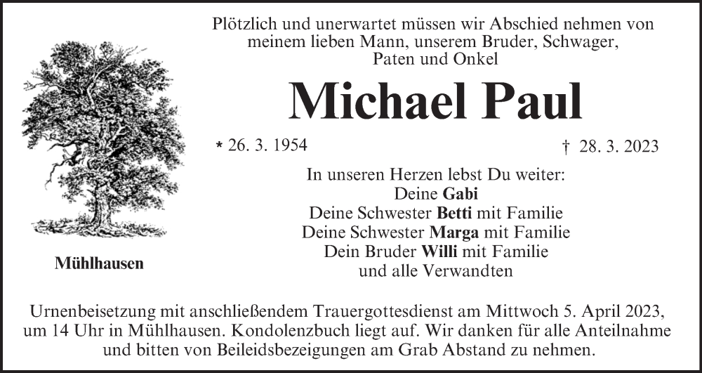 Hier finden Sie alle Traueranzeigen aus der Zeitung, die bisher für Michael Paul erschienen sind. Weitere Traueranzeigen, die in der Zeitung erscheinen, werden hier ebenfalls aufgelistet