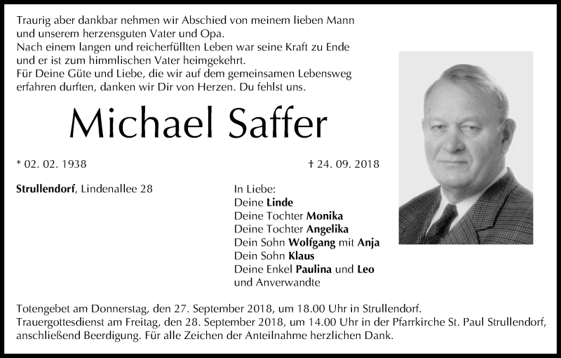 Hier finden Sie alle Traueranzeigen aus der Zeitung, die bisher für Michael Saffer erschienen sind. Weitere Traueranzeigen, die in der Zeitung erscheinen, werden hier ebenfalls aufgelistet