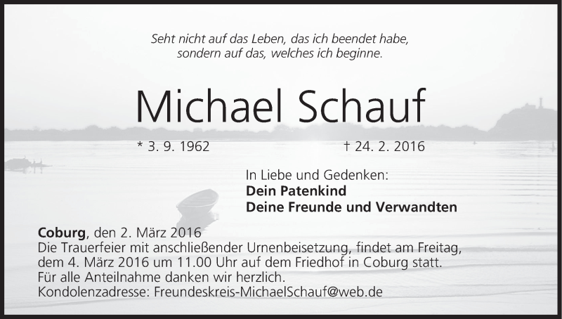 Hier finden Sie alle Traueranzeigen aus der Zeitung, die bisher für Michael Schauf erschienen sind. Weitere Traueranzeigen, die in der Zeitung erscheinen, werden hier ebenfalls aufgelistet