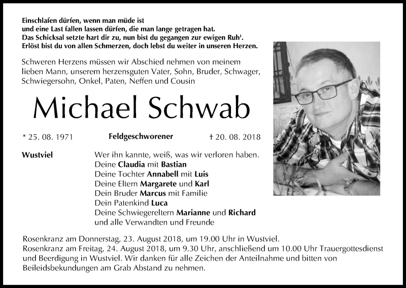 Hier finden Sie alle Traueranzeigen aus der Zeitung, die bisher für Michael Schwab erschienen sind. Weitere Traueranzeigen, die in der Zeitung erscheinen, werden hier ebenfalls aufgelistet