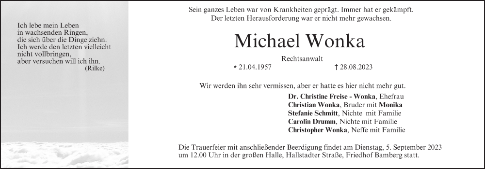 Hier finden Sie alle Traueranzeigen aus der Zeitung, die bisher für Michael Wonka erschienen sind. Weitere Traueranzeigen, die in der Zeitung erscheinen, werden hier ebenfalls aufgelistet