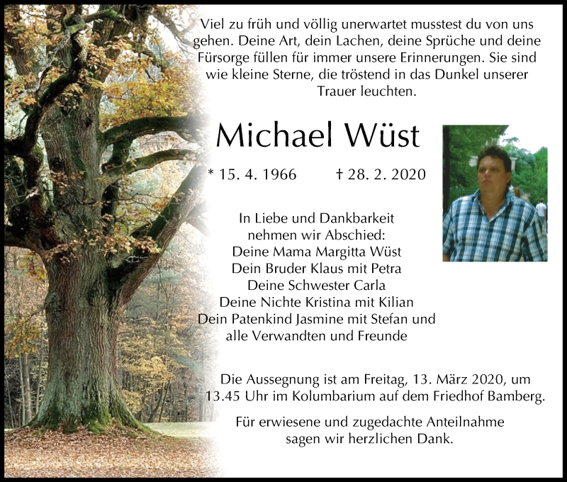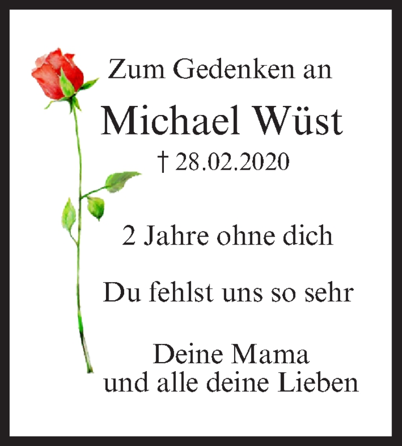Hier finden Sie alle Traueranzeigen aus der Zeitung, die bisher für Michael Wüst erschienen sind. Weitere Traueranzeigen, die in der Zeitung erscheinen, werden hier ebenfalls aufgelistet