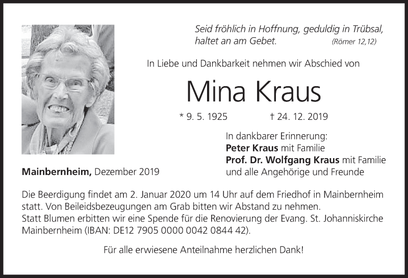 Hier finden Sie alle Traueranzeigen aus der Zeitung, die bisher für Mina Kraus erschienen sind. Weitere Traueranzeigen, die in der Zeitung erscheinen, werden hier ebenfalls aufgelistet