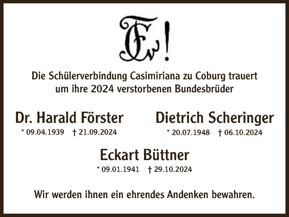 Hier finden Sie alle Traueranzeigen aus der Zeitung, die bisher für Nachruf Schülerverbindung Casimiriana zu Coburg erschienen sind. Weitere Traueranzeigen, die in der Zeitung erscheinen, werden hier ebenfalls aufgelistet