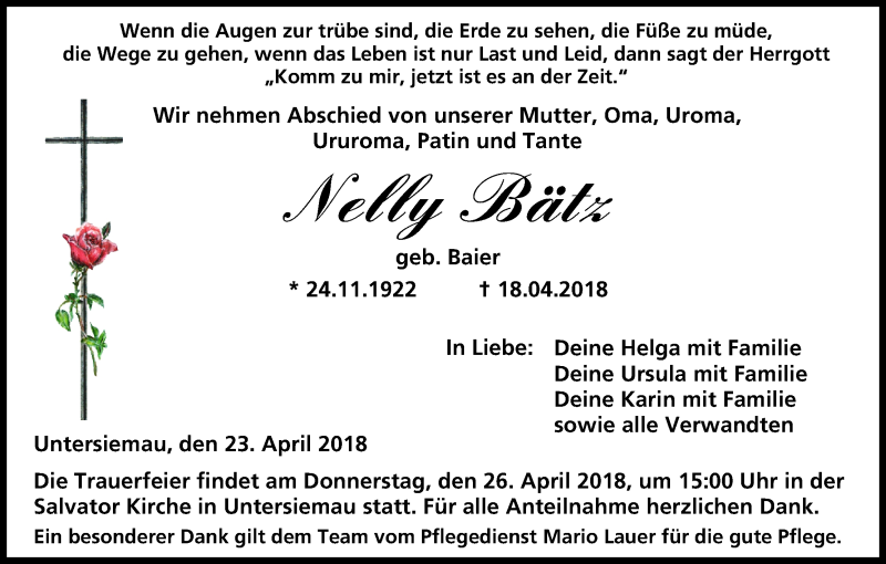 Hier finden Sie alle Traueranzeigen aus der Zeitung, die bisher für Nelly Bätz erschienen sind. Weitere Traueranzeigen, die in der Zeitung erscheinen, werden hier ebenfalls aufgelistet
