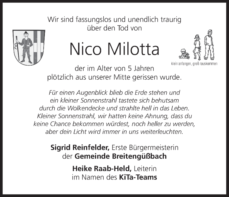 Hier finden Sie alle Traueranzeigen aus der Zeitung, die bisher für Nico Milotta erschienen sind. Weitere Traueranzeigen, die in der Zeitung erscheinen, werden hier ebenfalls aufgelistet