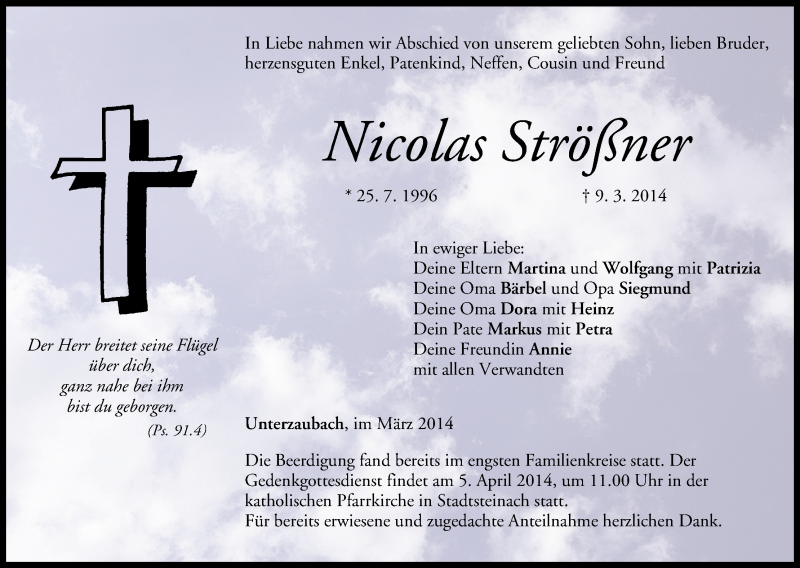 Hier finden Sie alle Traueranzeigen aus der Zeitung, die bisher für Nicolas Strößner erschienen sind. Weitere Traueranzeigen, die in der Zeitung erscheinen, werden hier ebenfalls aufgelistet