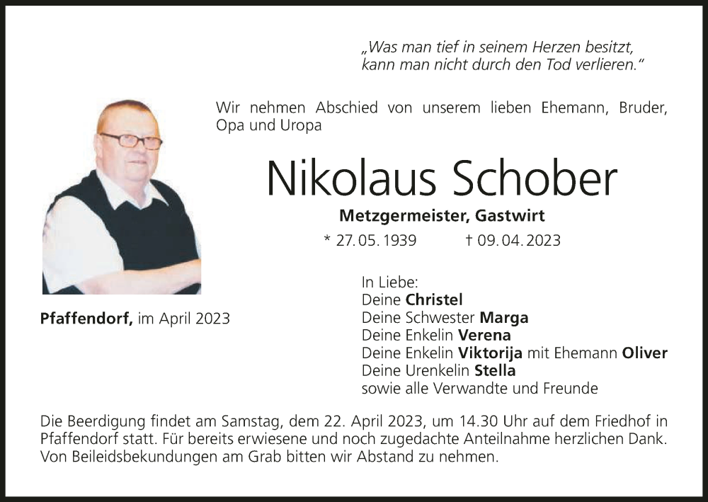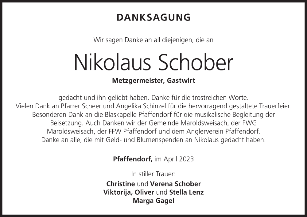 Hier finden Sie alle Traueranzeigen aus der Zeitung, die bisher für Nikolaus Schober erschienen sind. Weitere Traueranzeigen, die in der Zeitung erscheinen, werden hier ebenfalls aufgelistet