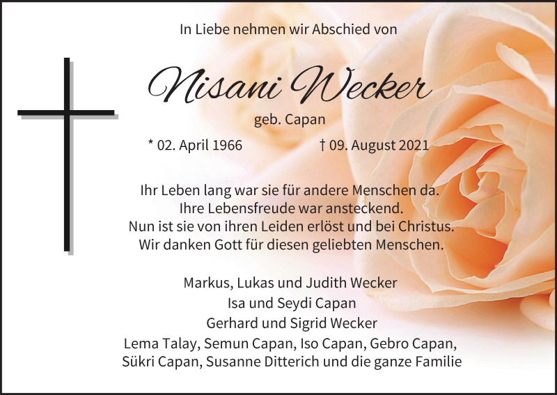 Hier finden Sie alle Traueranzeigen aus der Zeitung, die bisher für Nisani Wecker erschienen sind. Weitere Traueranzeigen, die in der Zeitung erscheinen, werden hier ebenfalls aufgelistet