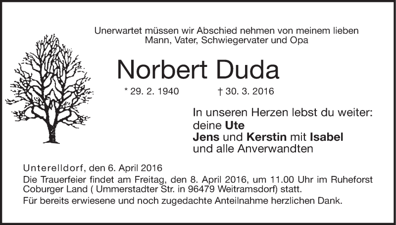 Hier finden Sie alle Traueranzeigen aus der Zeitung, die bisher für Norbert Duda erschienen sind. Weitere Traueranzeigen, die in der Zeitung erscheinen, werden hier ebenfalls aufgelistet