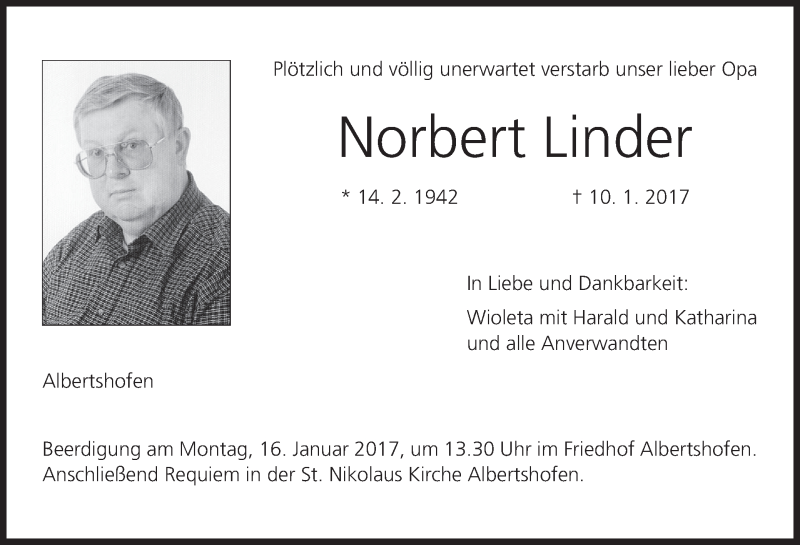 Hier finden Sie alle Traueranzeigen aus der Zeitung, die bisher für Norbert Linder erschienen sind. Weitere Traueranzeigen, die in der Zeitung erscheinen, werden hier ebenfalls aufgelistet