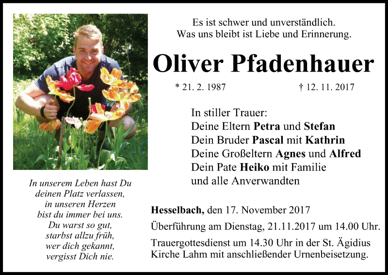 Hier finden Sie alle Traueranzeigen aus der Zeitung, die bisher für Oliver Pfadenhauer erschienen sind. Weitere Traueranzeigen, die in der Zeitung erscheinen, werden hier ebenfalls aufgelistet