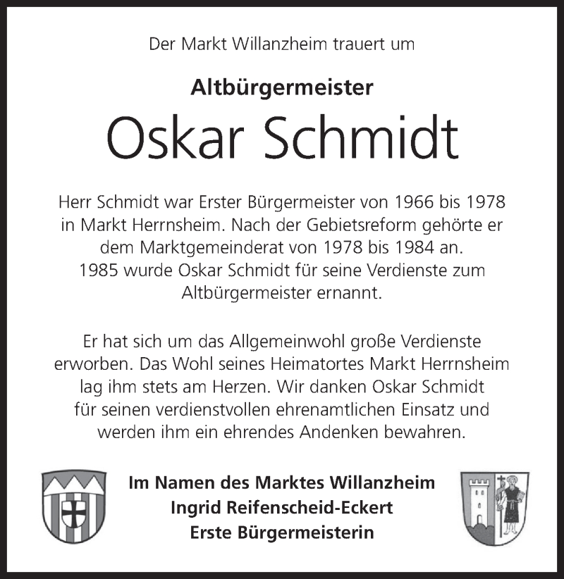 Hier finden Sie alle Traueranzeigen aus der Zeitung, die bisher für Oskar Schmidt erschienen sind. Weitere Traueranzeigen, die in der Zeitung erscheinen, werden hier ebenfalls aufgelistet