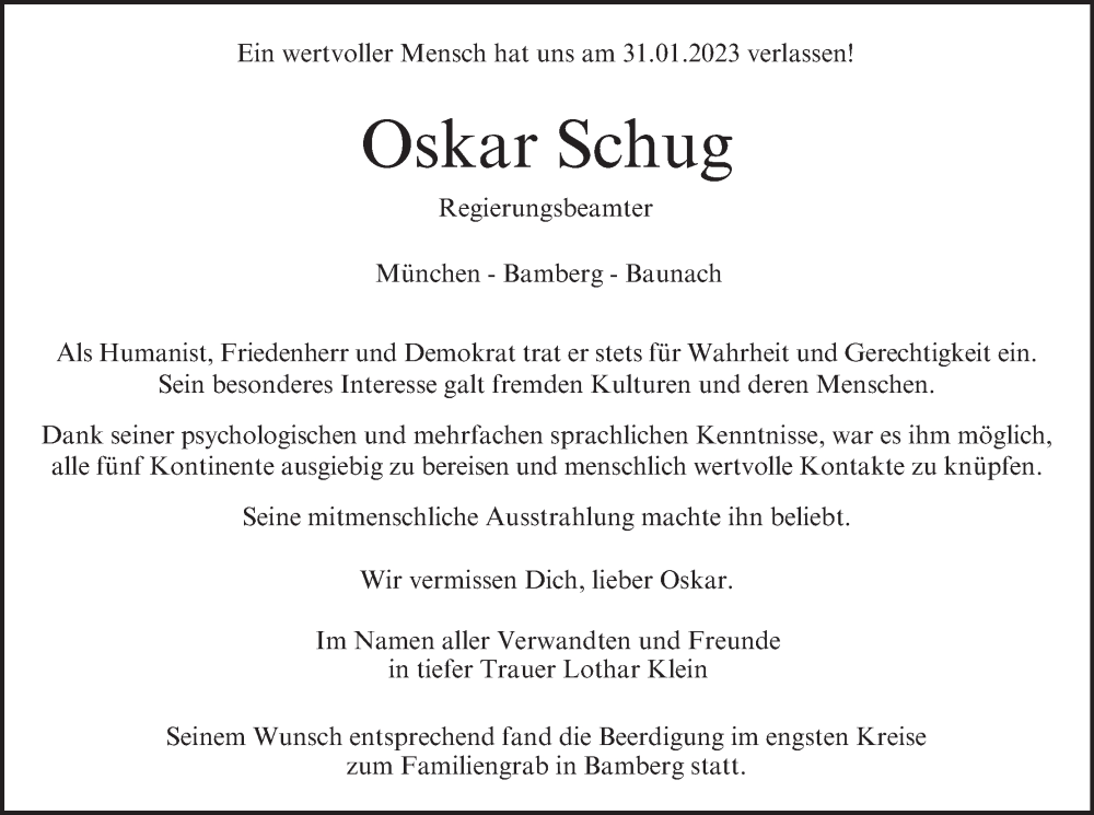 Hier finden Sie alle Traueranzeigen aus der Zeitung, die bisher für Oskar Schug erschienen sind. Weitere Traueranzeigen, die in der Zeitung erscheinen, werden hier ebenfalls aufgelistet