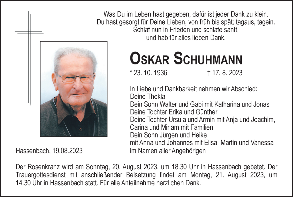 Hier finden Sie alle Traueranzeigen aus der Zeitung, die bisher für Oskar Schuhmann erschienen sind. Weitere Traueranzeigen, die in der Zeitung erscheinen, werden hier ebenfalls aufgelistet