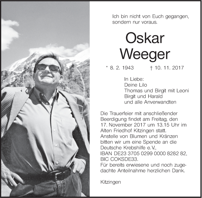 Hier finden Sie alle Traueranzeigen aus der Zeitung, die bisher für Oskar Weeger erschienen sind. Weitere Traueranzeigen, die in der Zeitung erscheinen, werden hier ebenfalls aufgelistet