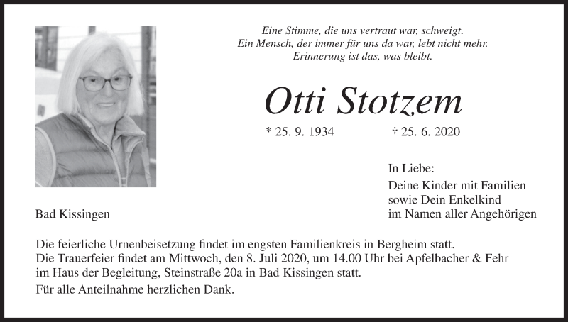 Hier finden Sie alle Traueranzeigen aus der Zeitung, die bisher für Otti Stotzem erschienen sind. Weitere Traueranzeigen, die in der Zeitung erscheinen, werden hier ebenfalls aufgelistet