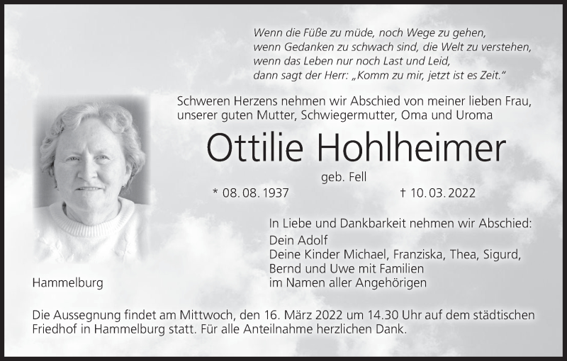 Hier finden Sie alle Traueranzeigen aus der Zeitung, die bisher für Ottilie Hohlheimer erschienen sind. Weitere Traueranzeigen, die in der Zeitung erscheinen, werden hier ebenfalls aufgelistet