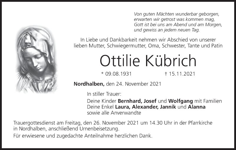 Hier finden Sie alle Traueranzeigen aus der Zeitung, die bisher für Ottilie Kübrich erschienen sind. Weitere Traueranzeigen, die in der Zeitung erscheinen, werden hier ebenfalls aufgelistet