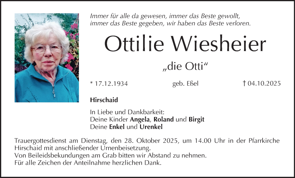 Hier finden Sie alle Traueranzeigen aus der Zeitung, die bisher für Ottilie Wiesheier erschienen sind. Weitere Traueranzeigen, die in der Zeitung erscheinen, werden hier ebenfalls aufgelistet