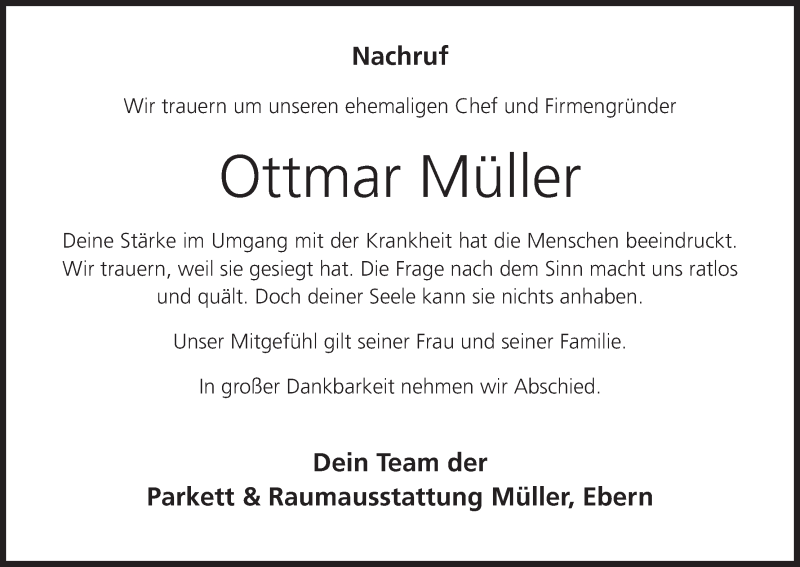 Hier finden Sie alle Traueranzeigen aus der Zeitung, die bisher für Ottmar Müller erschienen sind. Weitere Traueranzeigen, die in der Zeitung erscheinen, werden hier ebenfalls aufgelistet