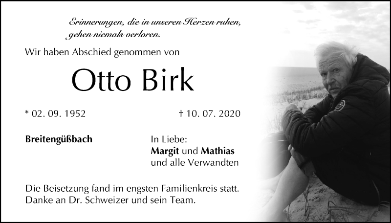 Hier finden Sie alle Traueranzeigen aus der Zeitung, die bisher für Otto Birk erschienen sind. Weitere Traueranzeigen, die in der Zeitung erscheinen, werden hier ebenfalls aufgelistet