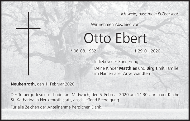 Hier finden Sie alle Traueranzeigen aus der Zeitung, die bisher für Otto Ebert erschienen sind. Weitere Traueranzeigen, die in der Zeitung erscheinen, werden hier ebenfalls aufgelistet