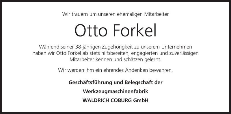 Hier finden Sie alle Traueranzeigen aus der Zeitung, die bisher für Otto Forkel erschienen sind. Weitere Traueranzeigen, die in der Zeitung erscheinen, werden hier ebenfalls aufgelistet
