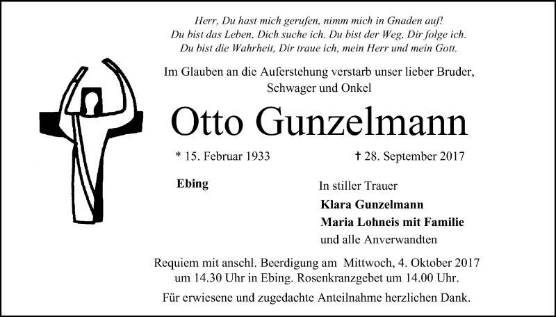 Hier finden Sie alle Traueranzeigen aus der Zeitung, die bisher für Otto Gunzelmann erschienen sind. Weitere Traueranzeigen, die in der Zeitung erscheinen, werden hier ebenfalls aufgelistet