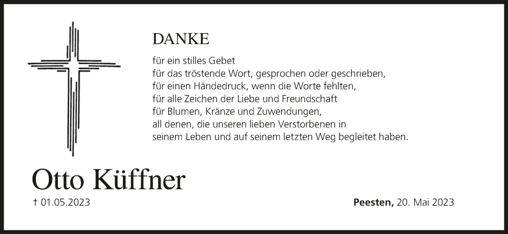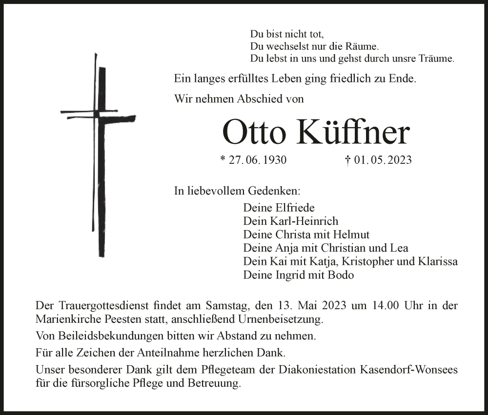 Hier finden Sie alle Traueranzeigen aus der Zeitung, die bisher für Otto Küffner erschienen sind. Weitere Traueranzeigen, die in der Zeitung erscheinen, werden hier ebenfalls aufgelistet