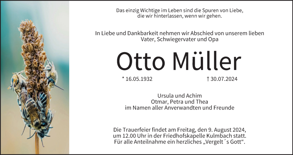 Hier finden Sie alle Traueranzeigen aus der Zeitung, die bisher für Otto Müller erschienen sind. Weitere Traueranzeigen, die in der Zeitung erscheinen, werden hier ebenfalls aufgelistet