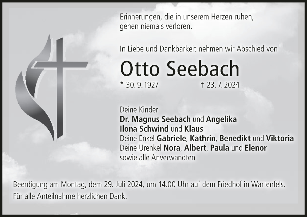 Hier finden Sie alle Traueranzeigen aus der Zeitung, die bisher für Otto Seebach erschienen sind. Weitere Traueranzeigen, die in der Zeitung erscheinen, werden hier ebenfalls aufgelistet