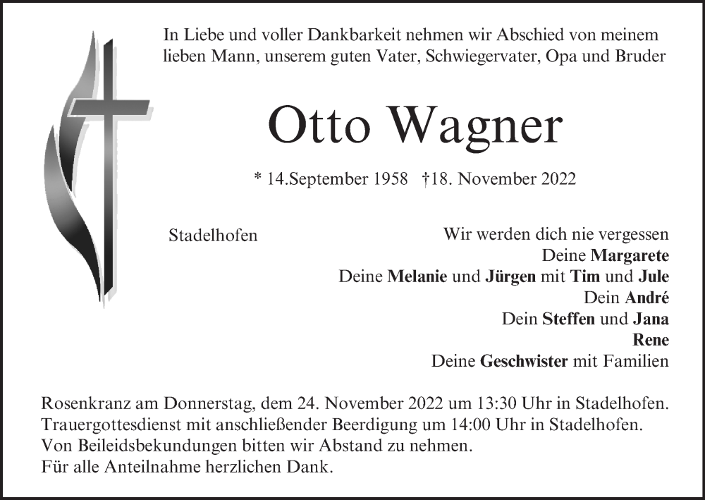 Hier finden Sie alle Traueranzeigen aus der Zeitung, die bisher für Otto Wagner erschienen sind. Weitere Traueranzeigen, die in der Zeitung erscheinen, werden hier ebenfalls aufgelistet