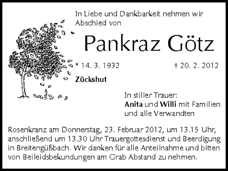 Hier finden Sie alle Traueranzeigen aus der Zeitung, die bisher für Pankraz Götz erschienen sind. Weitere Traueranzeigen, die in der Zeitung erscheinen, werden hier ebenfalls aufgelistet