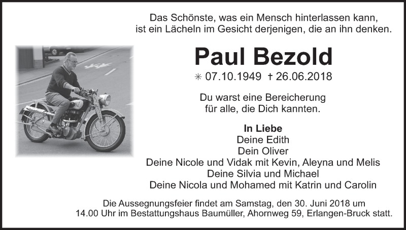 Hier finden Sie alle Traueranzeigen aus der Zeitung, die bisher für Paul Bezold erschienen sind. Weitere Traueranzeigen, die in der Zeitung erscheinen, werden hier ebenfalls aufgelistet