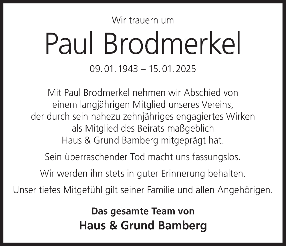Hier finden Sie alle Traueranzeigen aus der Zeitung, die bisher für Paul Brodmerkel erschienen sind. Weitere Traueranzeigen, die in der Zeitung erscheinen, werden hier ebenfalls aufgelistet
