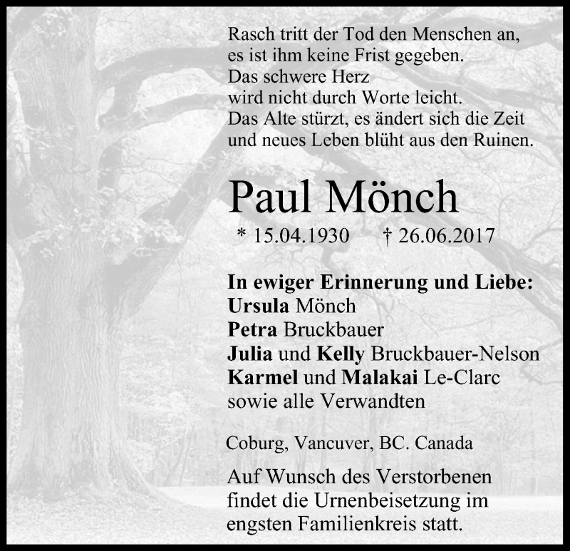 Hier finden Sie alle Traueranzeigen aus der Zeitung, die bisher für Paul Mönch erschienen sind. Weitere Traueranzeigen, die in der Zeitung erscheinen, werden hier ebenfalls aufgelistet
