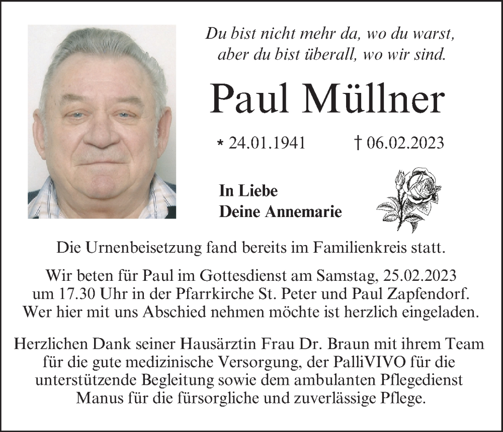 Hier finden Sie alle Traueranzeigen aus der Zeitung, die bisher für Paul Müllner erschienen sind. Weitere Traueranzeigen, die in der Zeitung erscheinen, werden hier ebenfalls aufgelistet