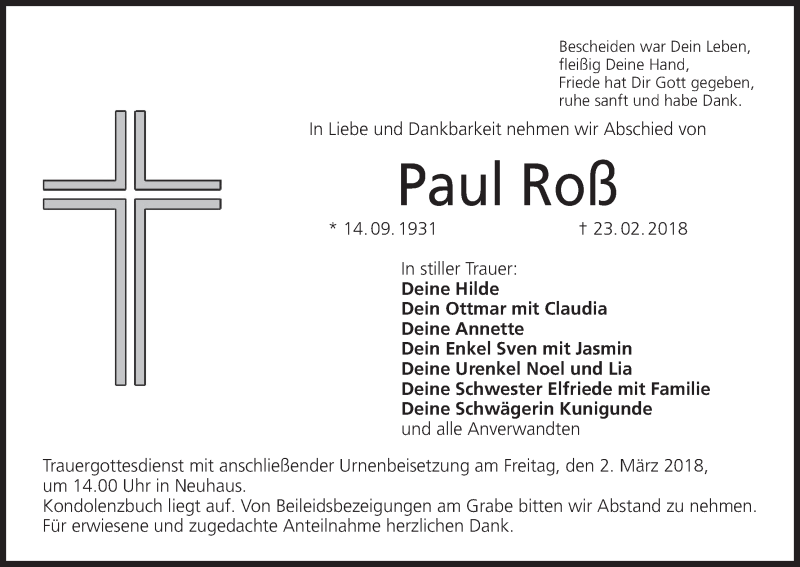 Hier finden Sie alle Traueranzeigen aus der Zeitung, die bisher für Paul Roß erschienen sind. Weitere Traueranzeigen, die in der Zeitung erscheinen, werden hier ebenfalls aufgelistet