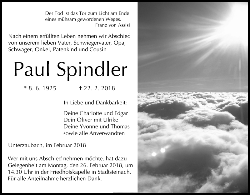 Hier finden Sie alle Traueranzeigen aus der Zeitung, die bisher für Paul Spindler erschienen sind. Weitere Traueranzeigen, die in der Zeitung erscheinen, werden hier ebenfalls aufgelistet