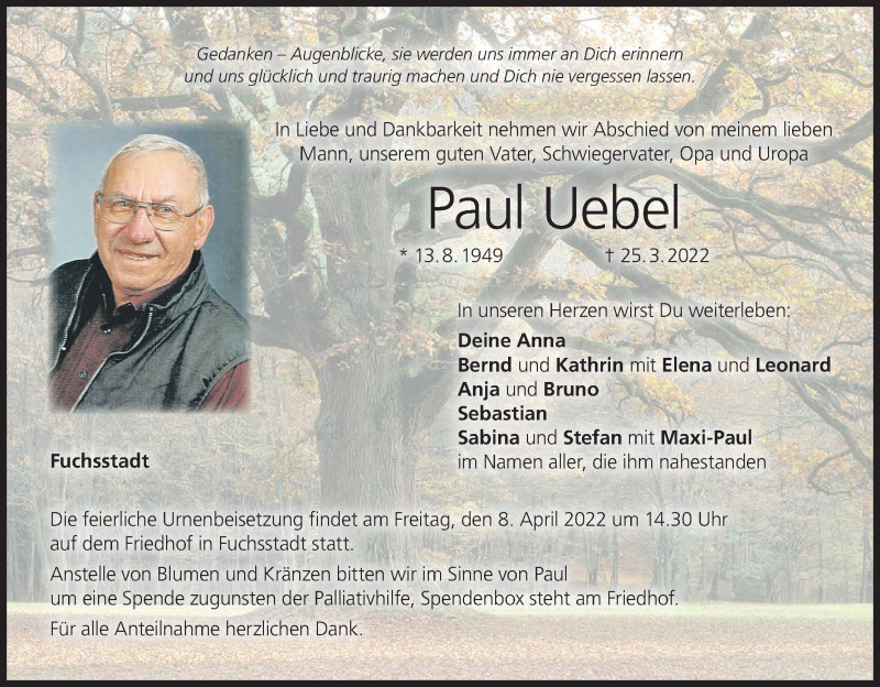 Hier finden Sie alle Traueranzeigen aus der Zeitung, die bisher für Paul Uebel erschienen sind. Weitere Traueranzeigen, die in der Zeitung erscheinen, werden hier ebenfalls aufgelistet