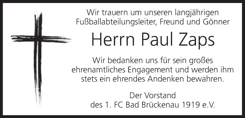 Hier finden Sie alle Traueranzeigen aus der Zeitung, die bisher für Paul Zaps erschienen sind. Weitere Traueranzeigen, die in der Zeitung erscheinen, werden hier ebenfalls aufgelistet