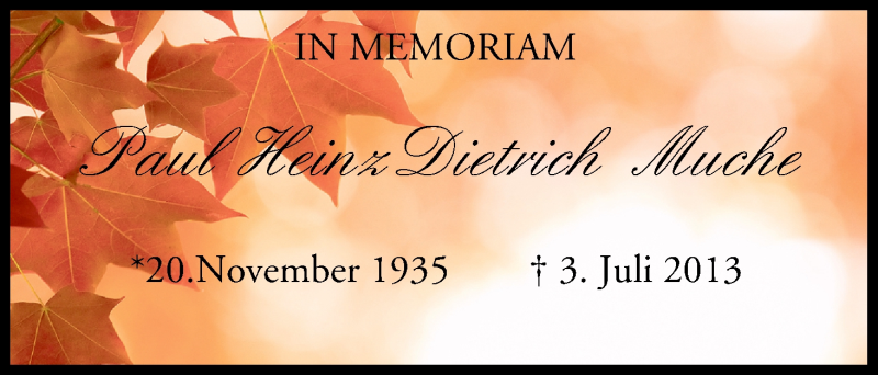 Hier finden Sie alle Traueranzeigen aus der Zeitung, die bisher für Paul HeinzDietrich Muche erschienen sind. Weitere Traueranzeigen, die in der Zeitung erscheinen, werden hier ebenfalls aufgelistet
